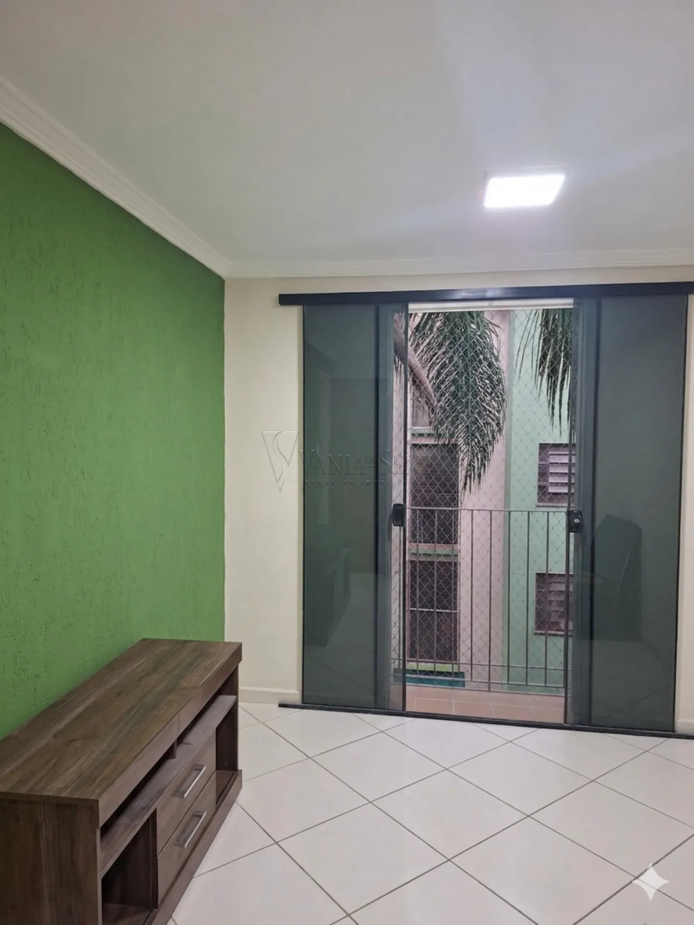 - Sala de estar com sofá e rack para televisão