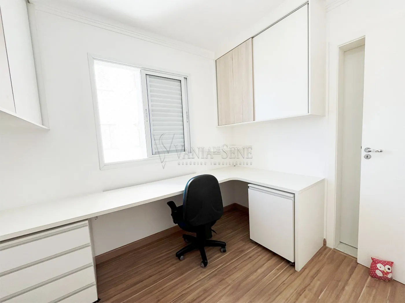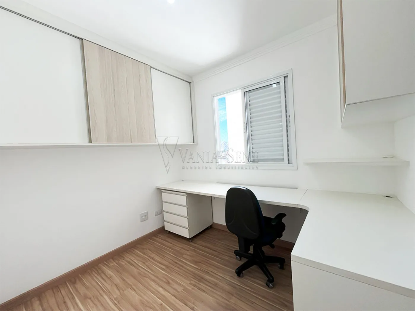 - O escritório conta com armários e mesa planejada, além de uma cadeira de escritório, ele conta com acesso para o banheiro social, podendo torna-lo uma suíte. O segundo dormitório conta com cama, armário planejado, 2 criados mudos e um cabideiro. O terceiro e último dormitório conta com cama e armários planejados. Todos os quartos tem um lindo piso laminado e estão com pintura nova na cor branca.