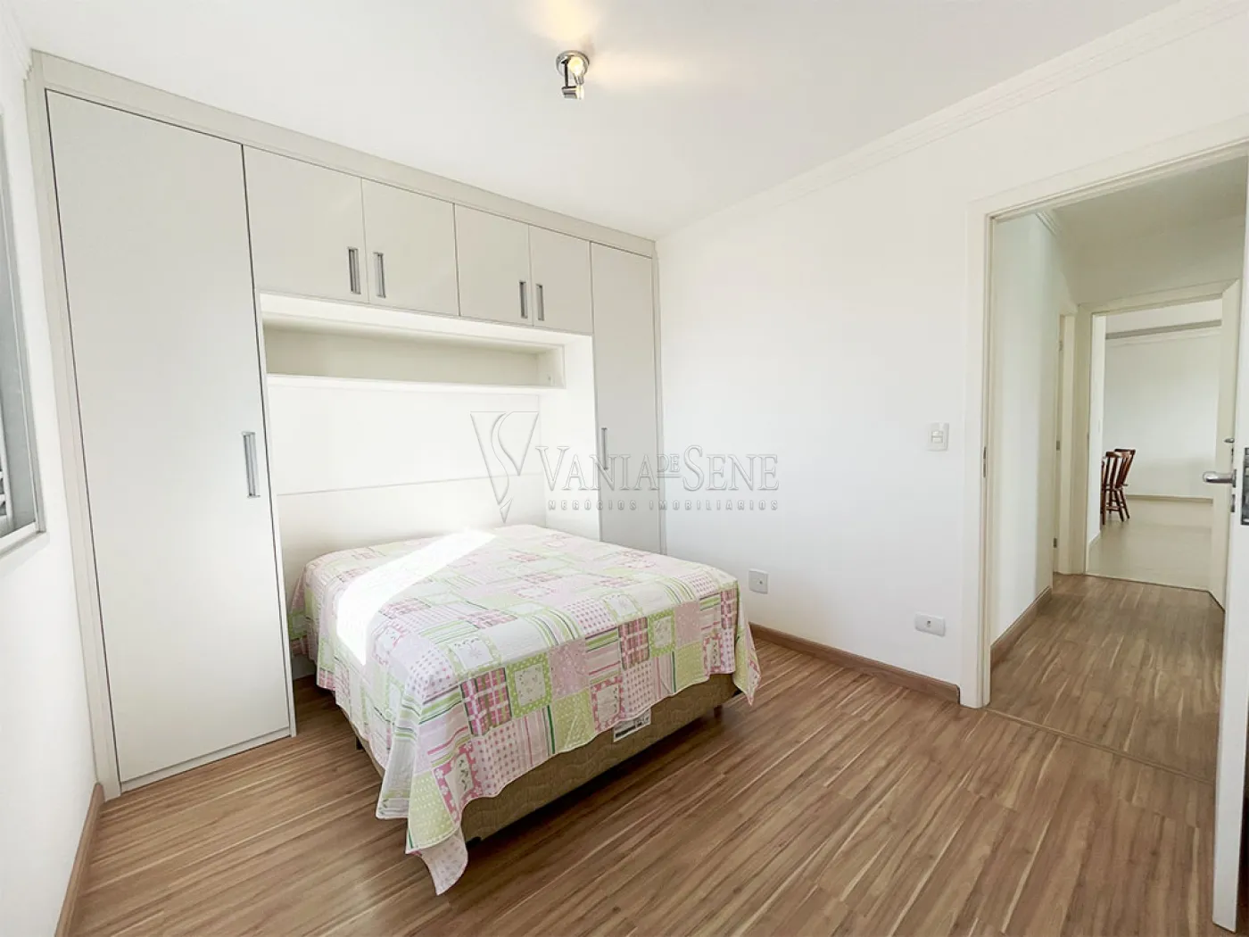 - Corredor entre os quartos com armário planejados para melhor organização do dia a dia, além de iluminação própria e um lindo piso laminado - ele também conta com uma porta para maior privacidade.