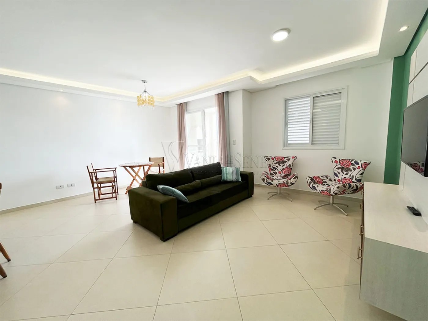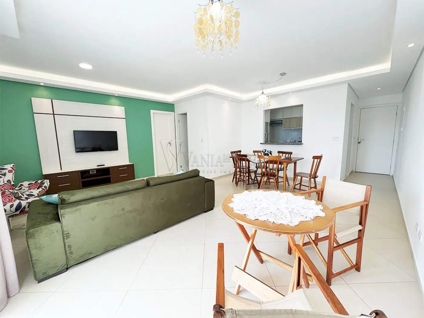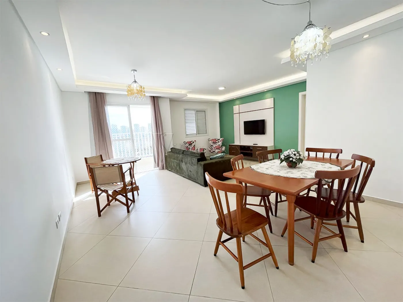 - Sala mobiliada com sofá, 2 cadeiras confortáveis, 2 mesas, sendo 1 com 6 cadeiras e outra com 2 cadeiras de tecido, painel e televisão. Conta também com dois lindos lustres pendentes, led e spots embutidos. O piso é uma linda cerâmica fria na cor bege, temos também uma parede pintada de verde e o restante na cor branca, que foram recentemente pintadas.