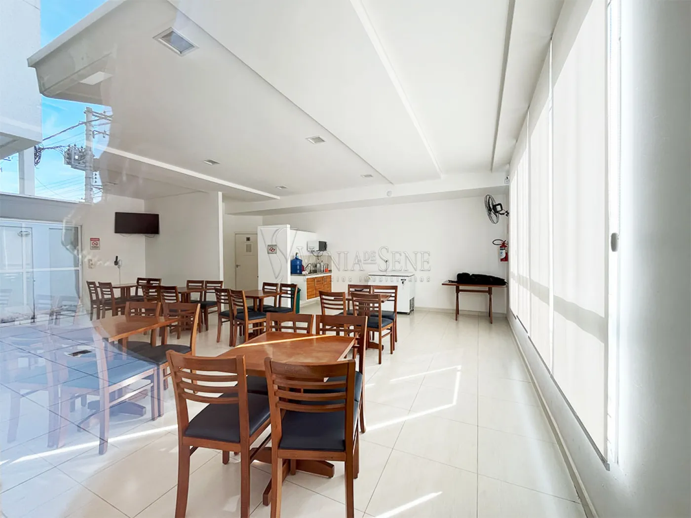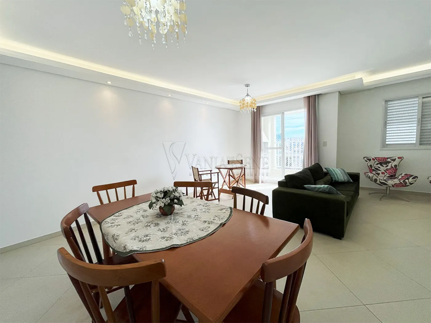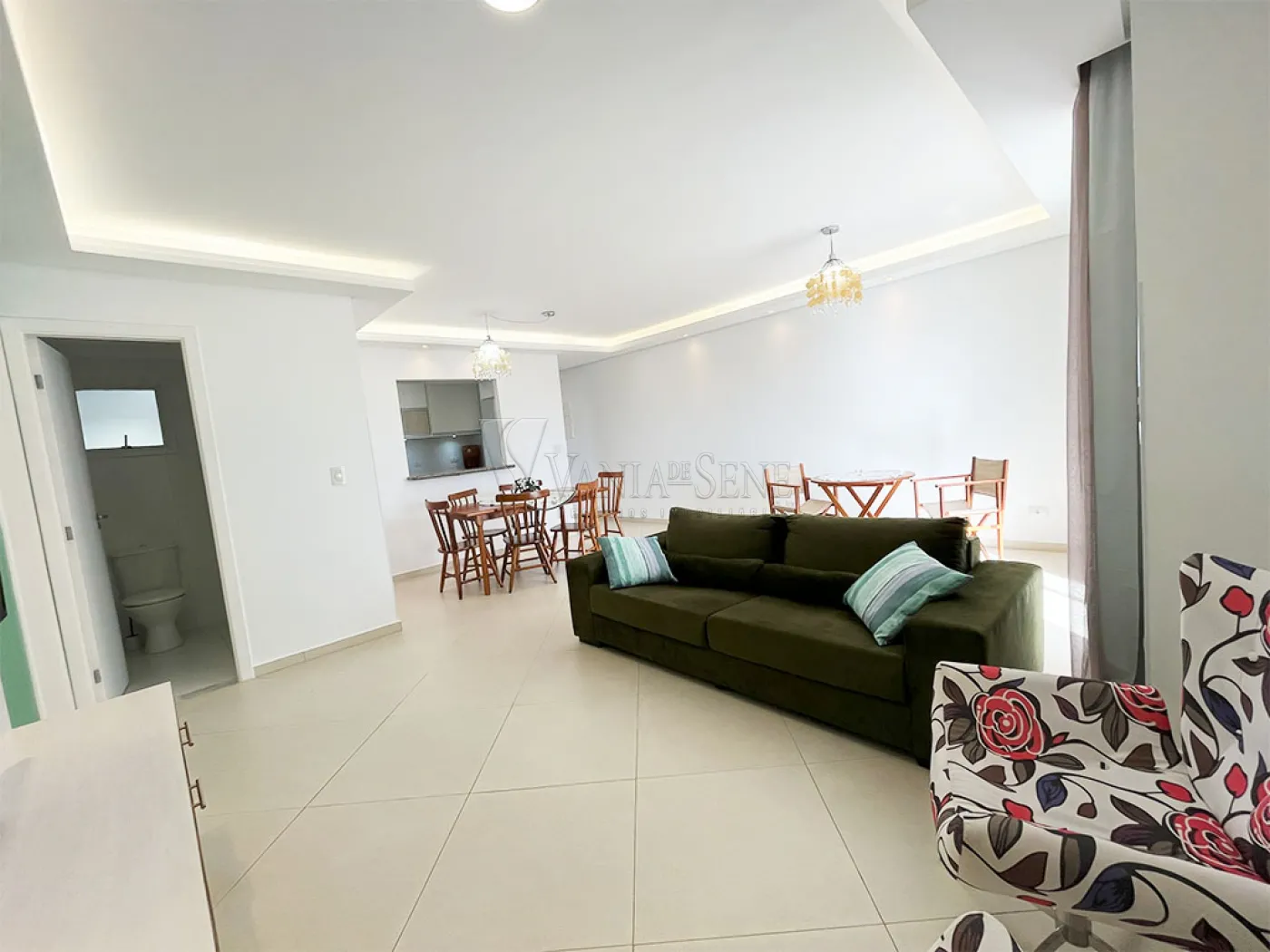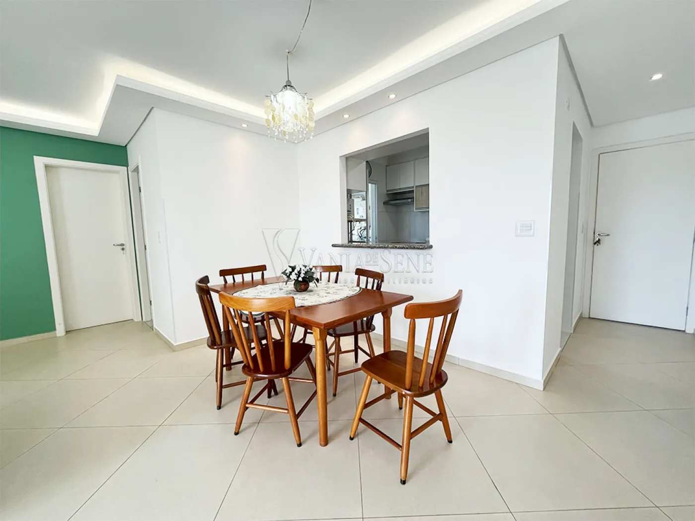 - Sala mobiliada com sofá, 2 cadeiras confortáveis, 2 mesas, sendo 1 com 6 cadeiras e outra com 2 cadeiras de tecido, painel e televisão. Conta também com dois lindos lustres pendentes, led e spots embutidos. O piso é uma linda cerâmica fria na cor bege, temos também uma parede pintada de verde e o restante na cor branca, que foram recentemente pintadas.