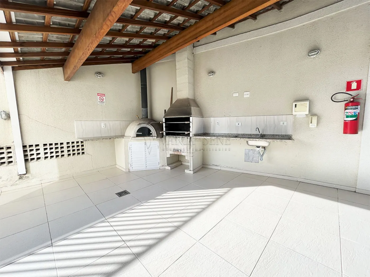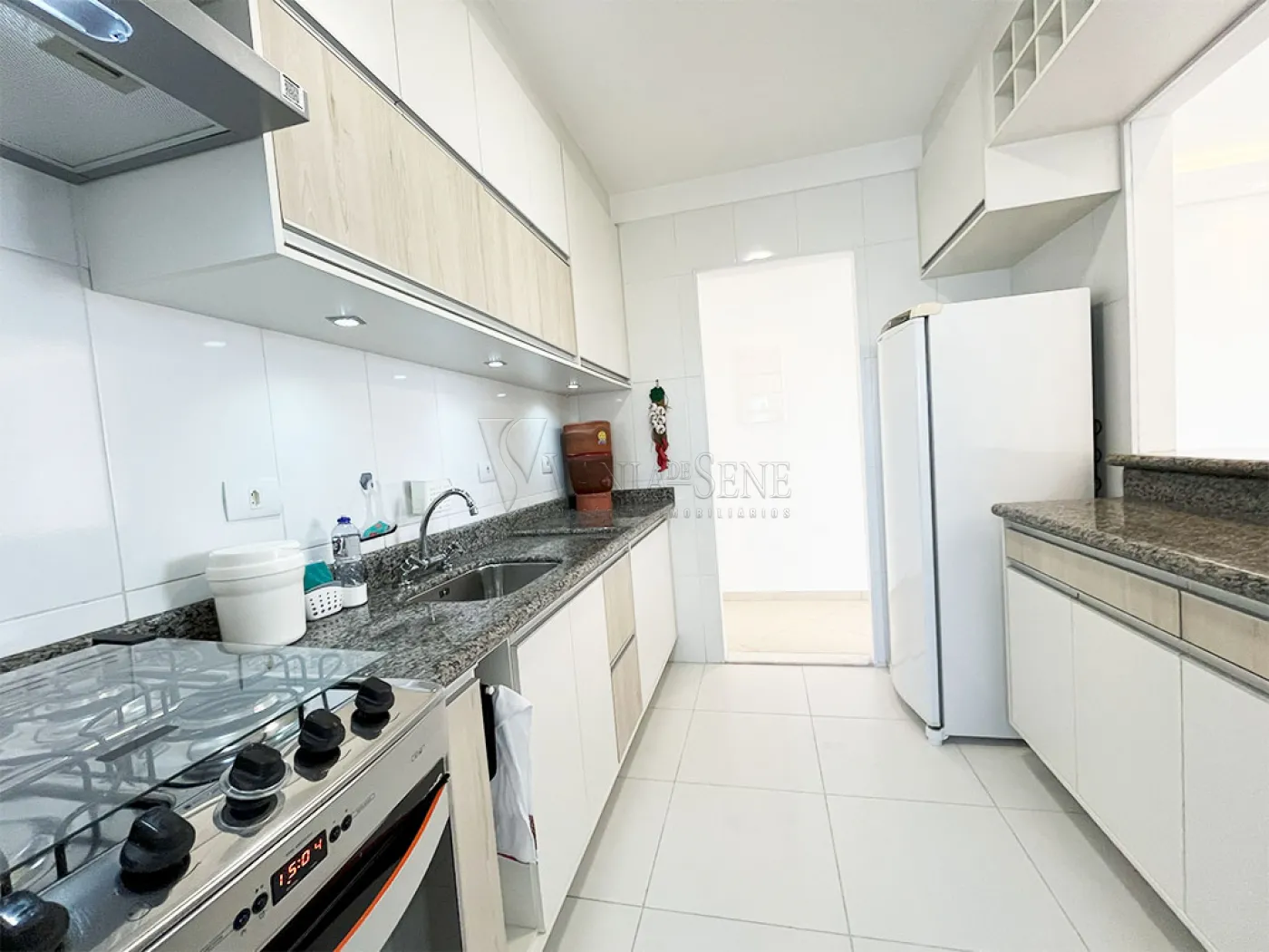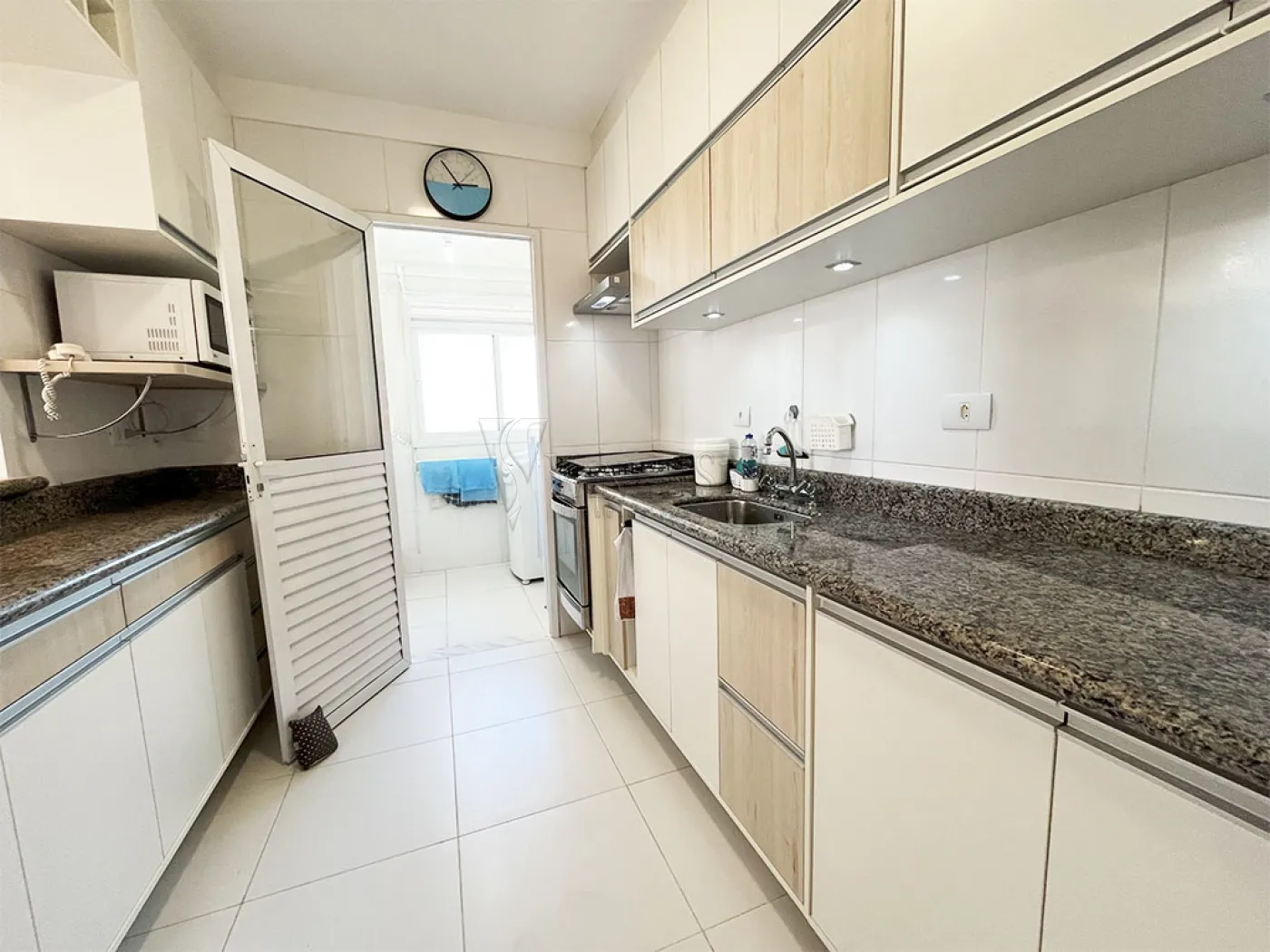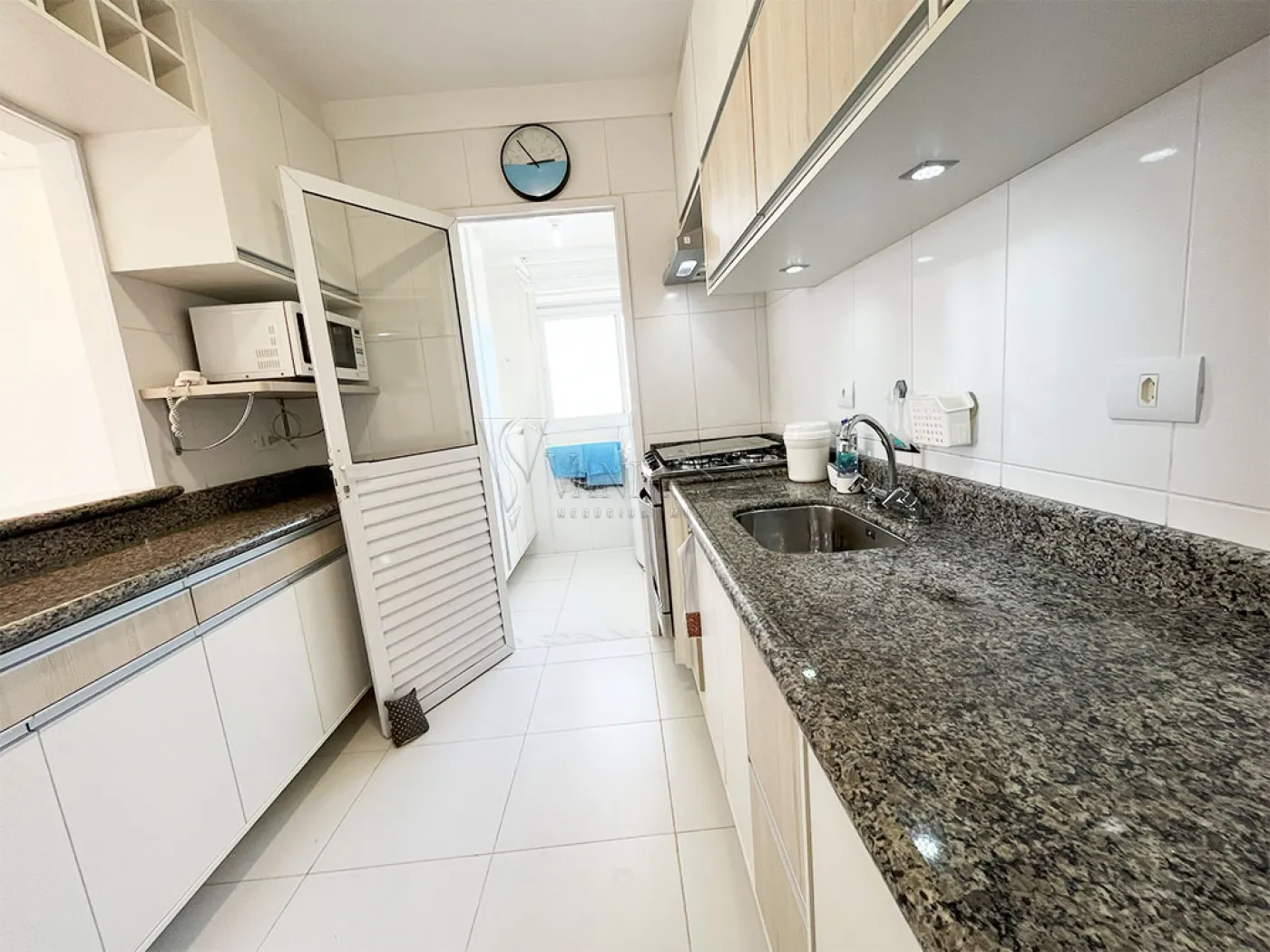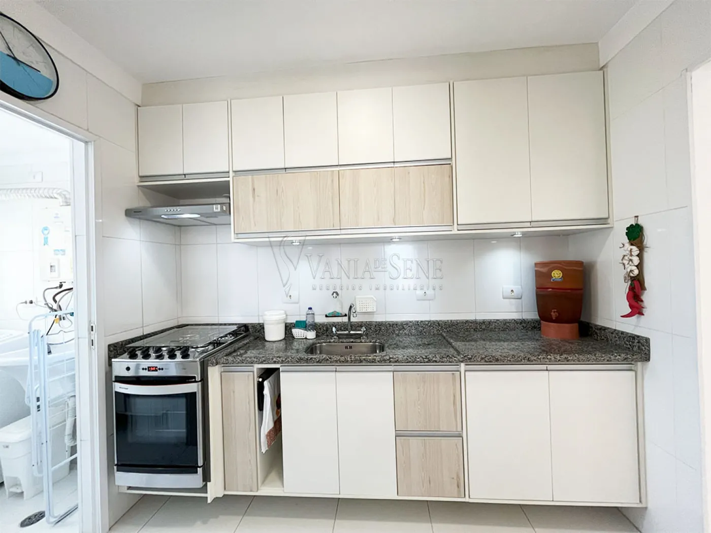 - Lindos armários planejados na cor bege com balcão de granito. A cozinha conta também com fogão, coifa, micro-ondas e geladeira. O grande diferencial da cozinha é o passa prato. A cozinha conta com um lindo piso de cerâmica na cor branca, assim como os azulejos.