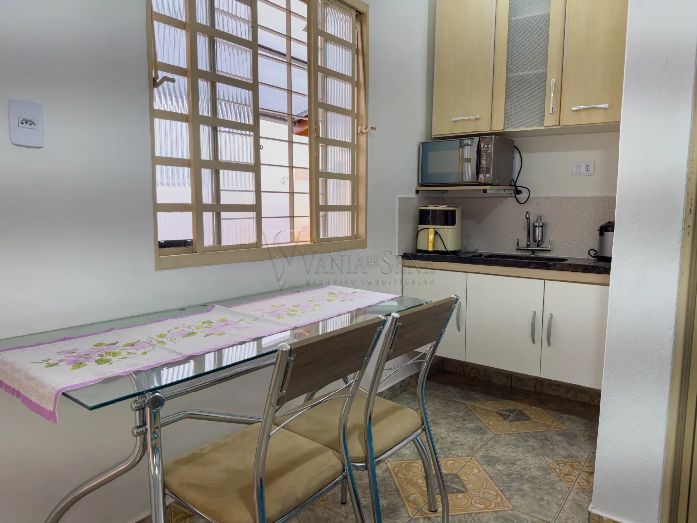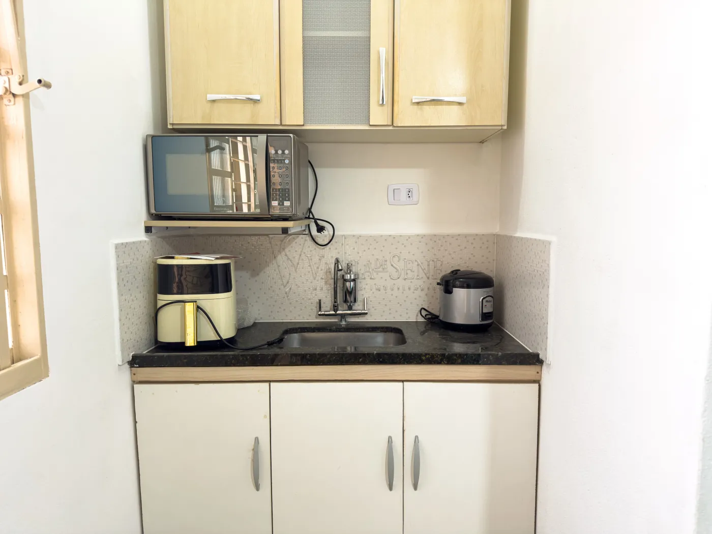 - Armários, pia, air fryer, panela de arroz e micro-ondas