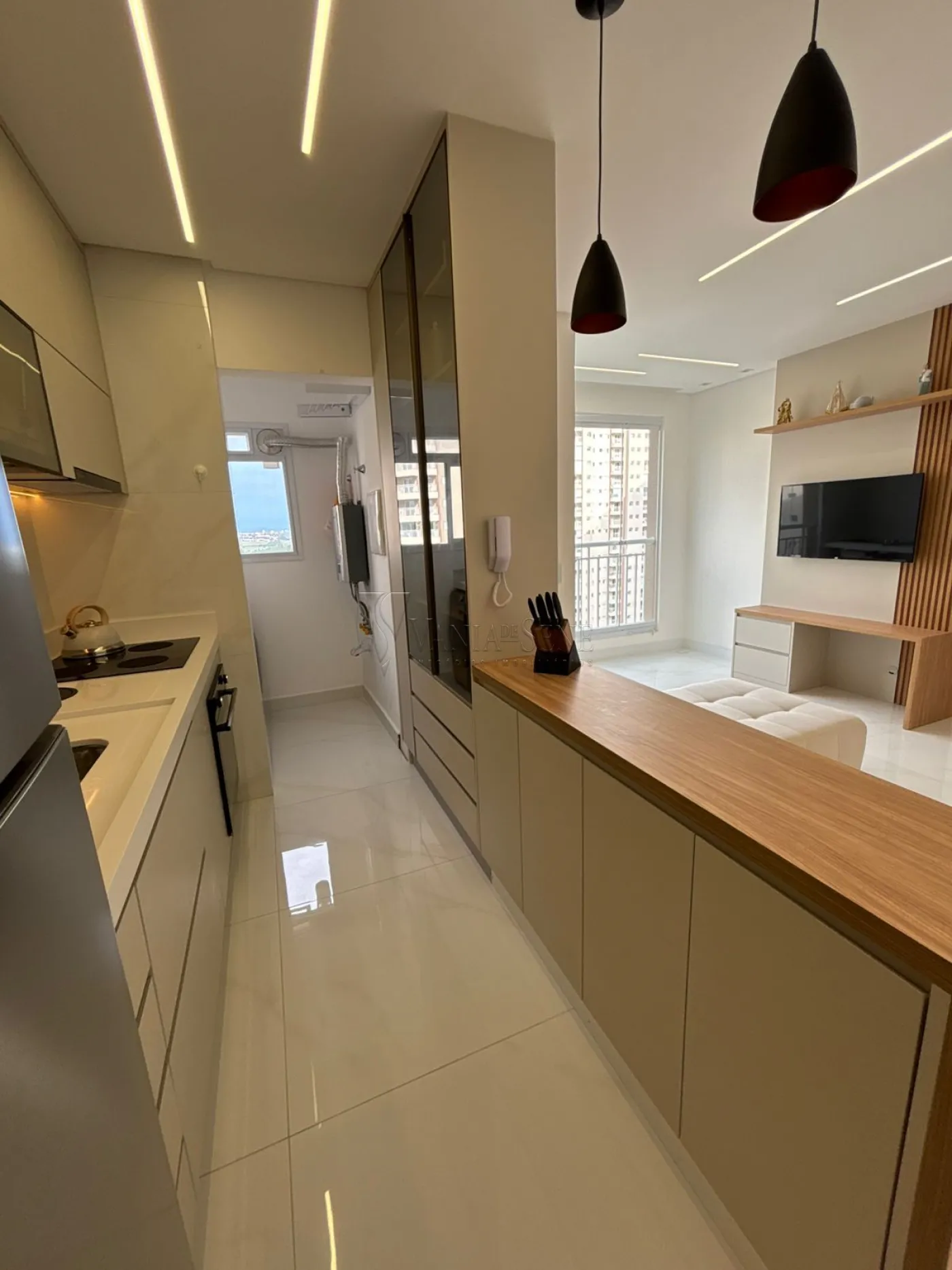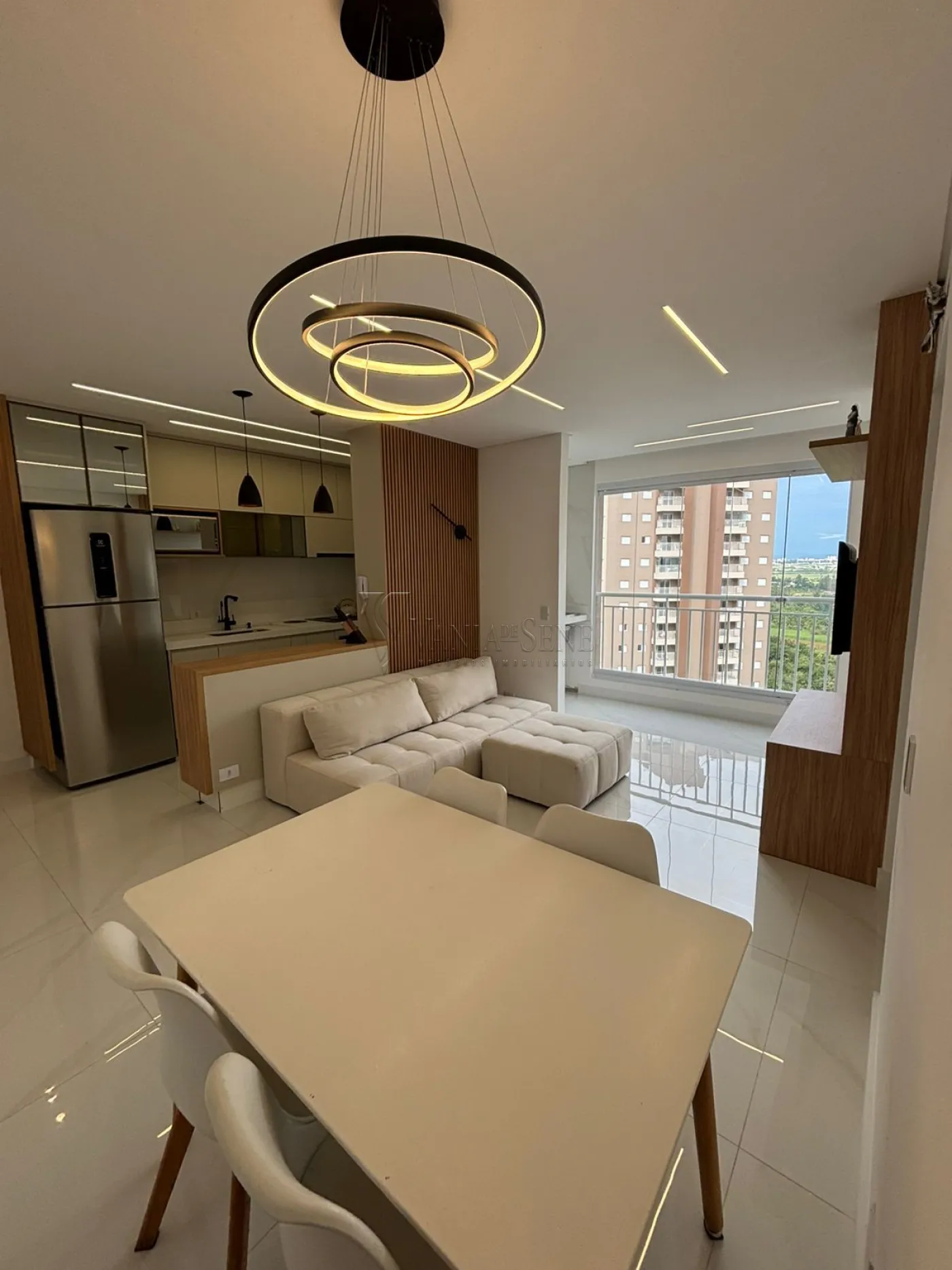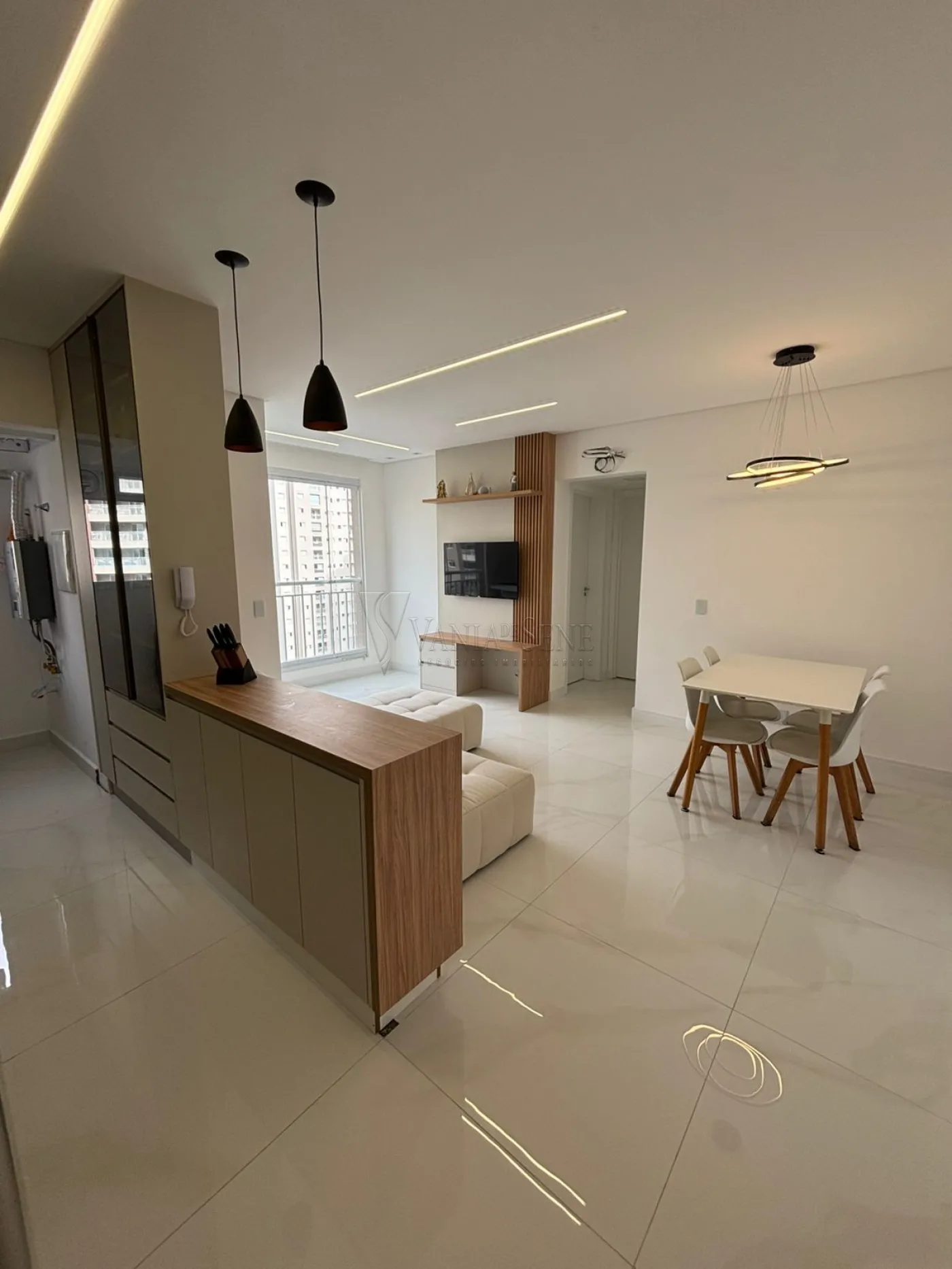 - Sala: Sala integrada à cozinha, com espaço para 2 ambientes, painel de TV planejado, lustre e iluminação em LED, proporcionando um ambiente iluminado e aconchegante.