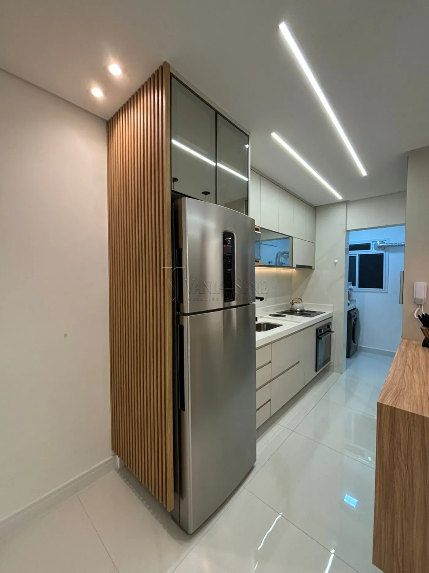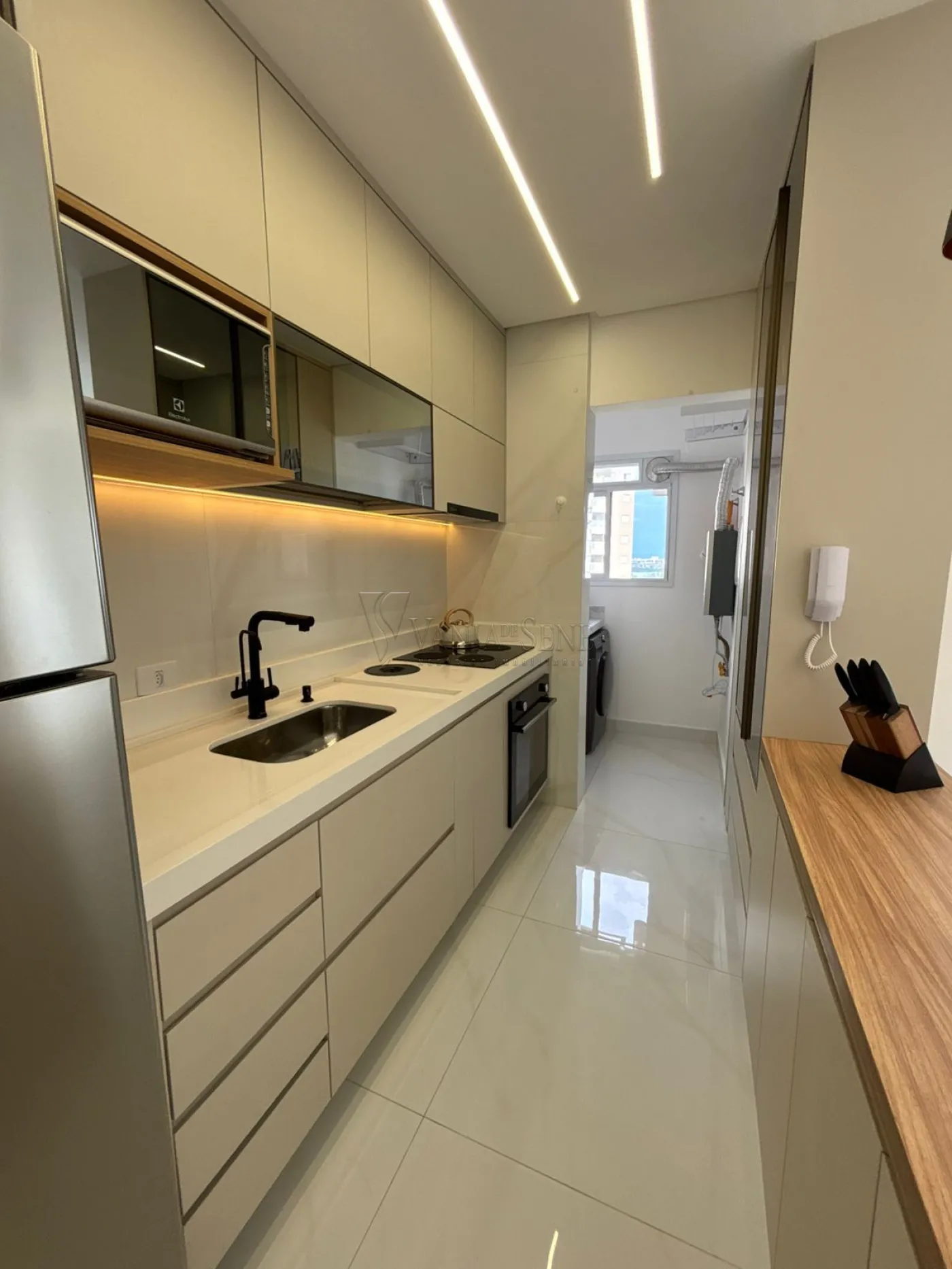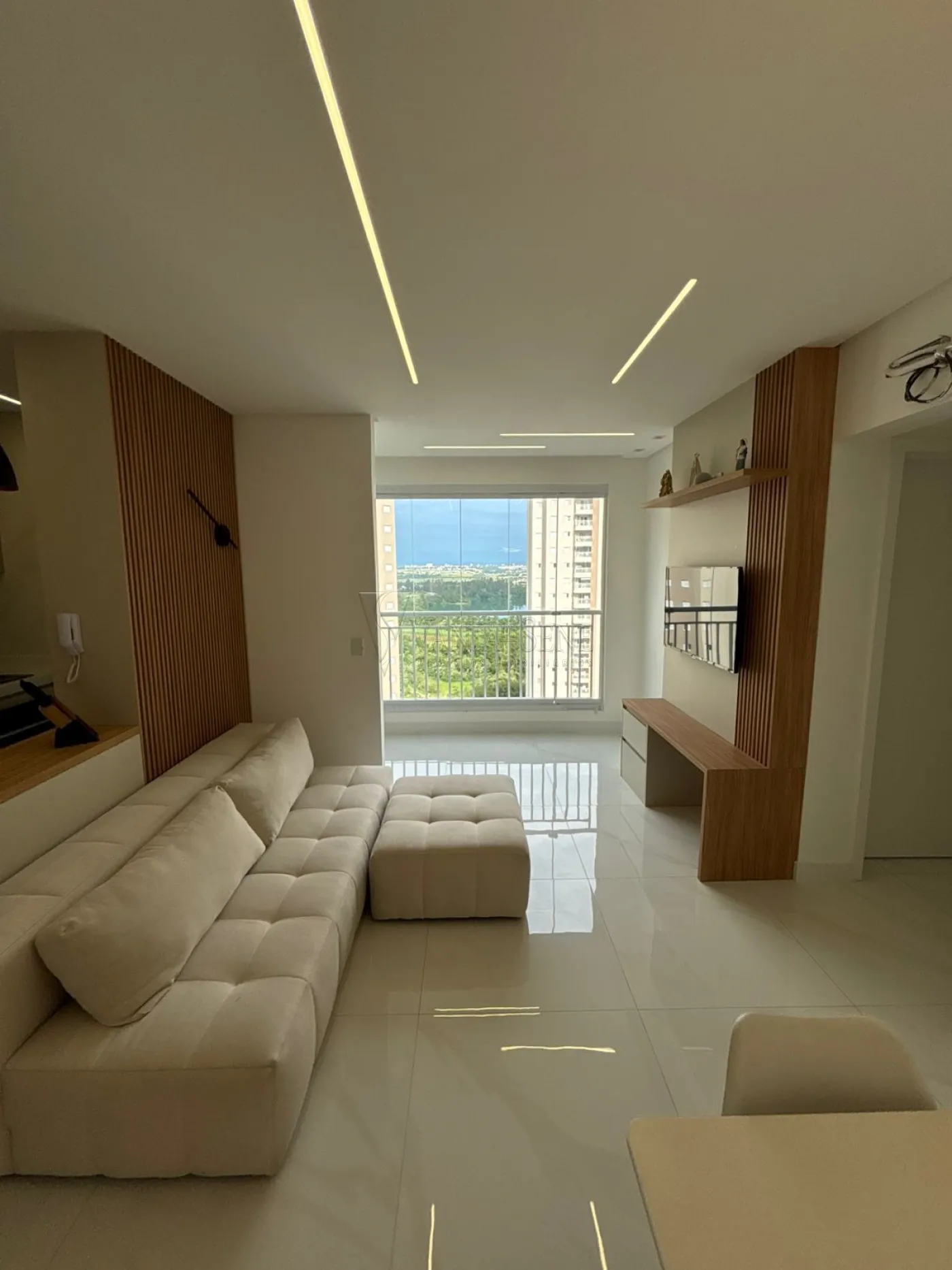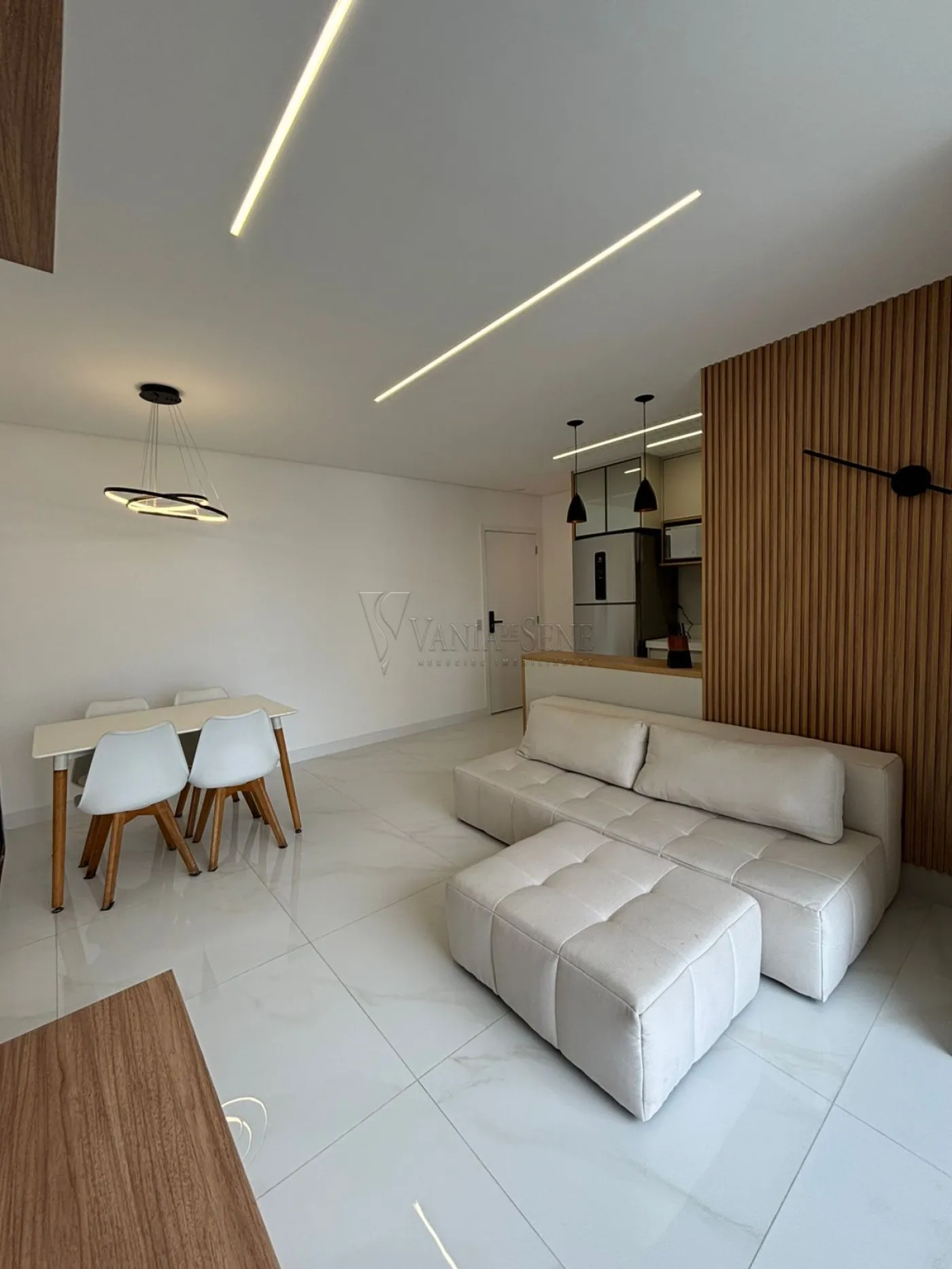- Sala: Sala integrada à cozinha, com espaço para 2 ambientes, painel de TV planejado, lustre e iluminação em LED, proporcionando um ambiente iluminado e aconchegante.