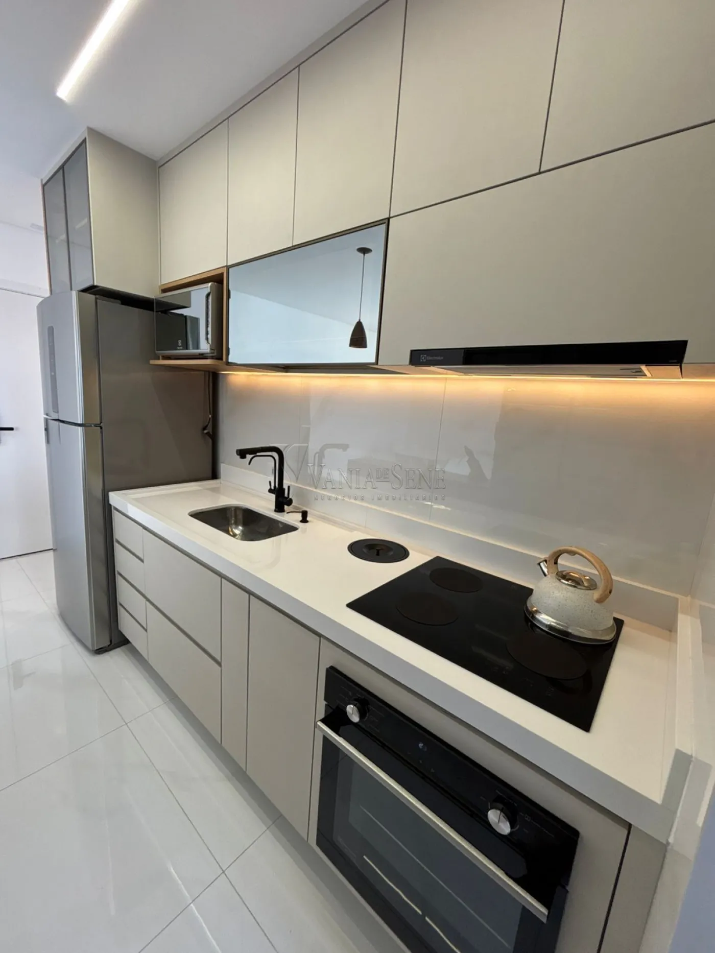 - Cozinha: 100% planejada, equipada com pedras em quartzo branco, ideal para quem aprecia um espaço funcional e elegante.