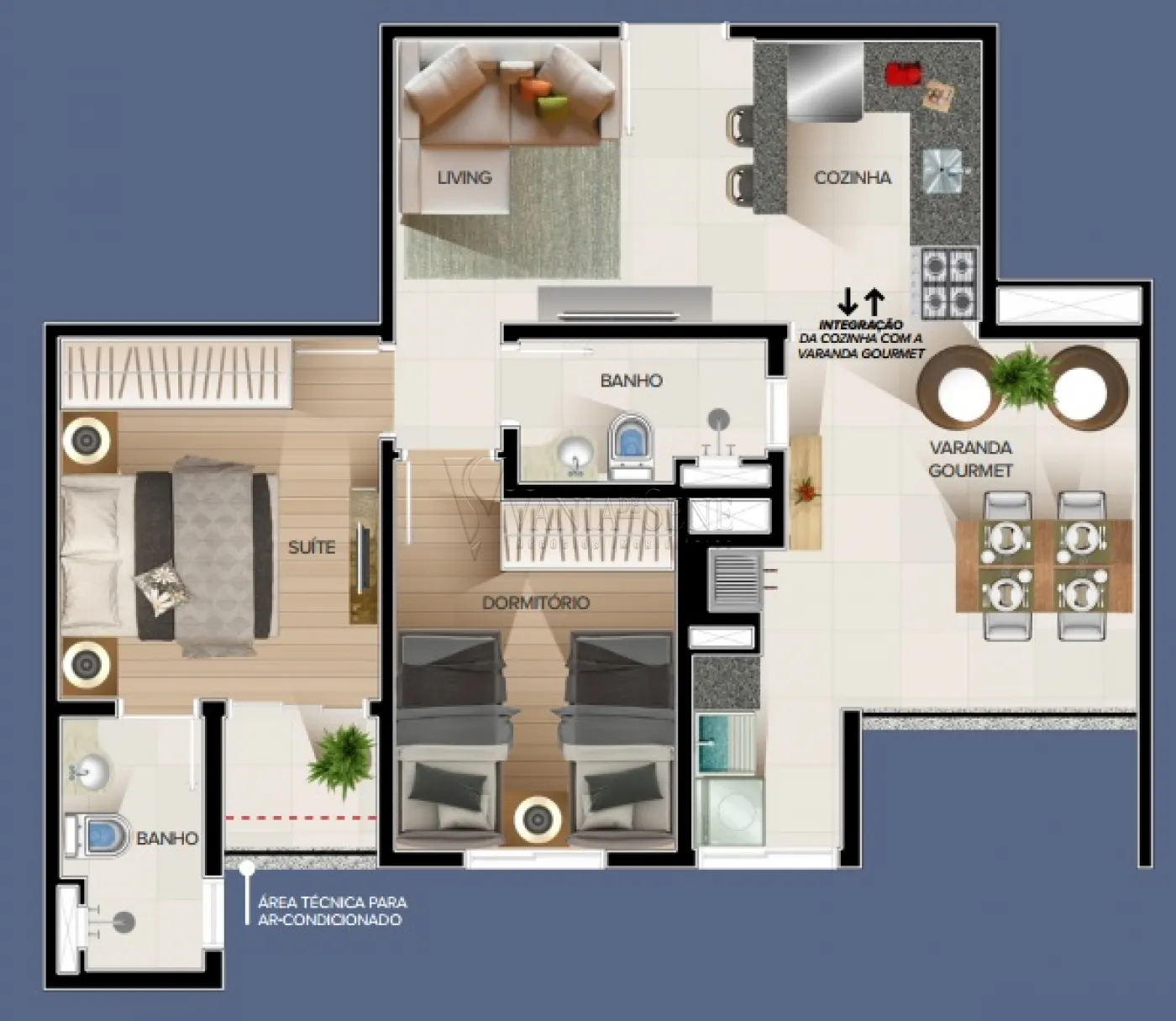 - Dormitórios: 2, sendo 1 suíte