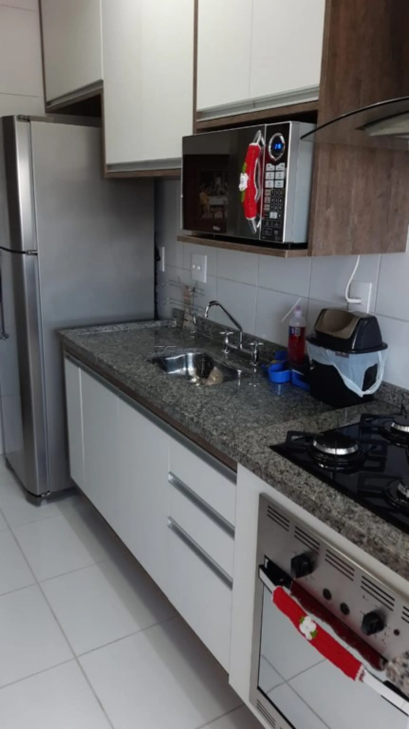 Cozinha equipada com armários, fogão e geladeira