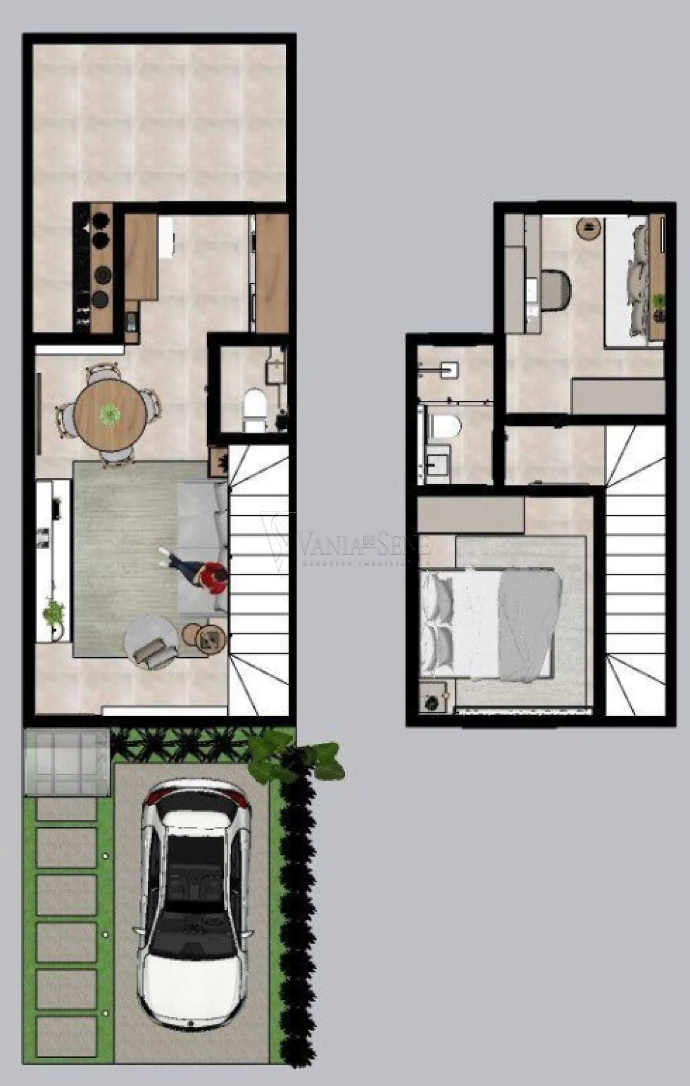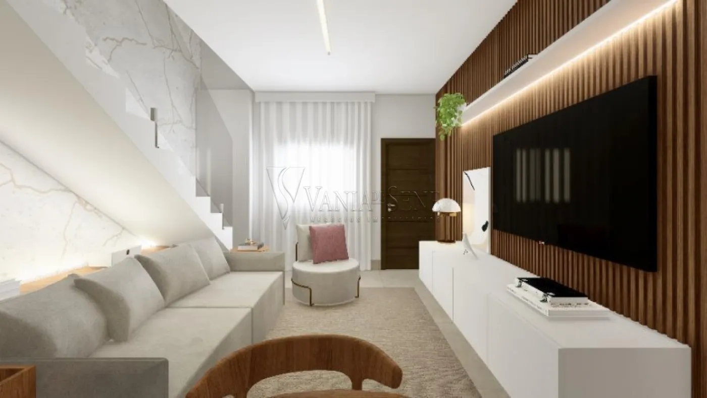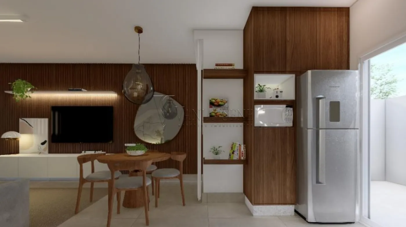 2 dormitórios, sala, cozinha, wc social, área de serviço, jardim, vaga de garagem.