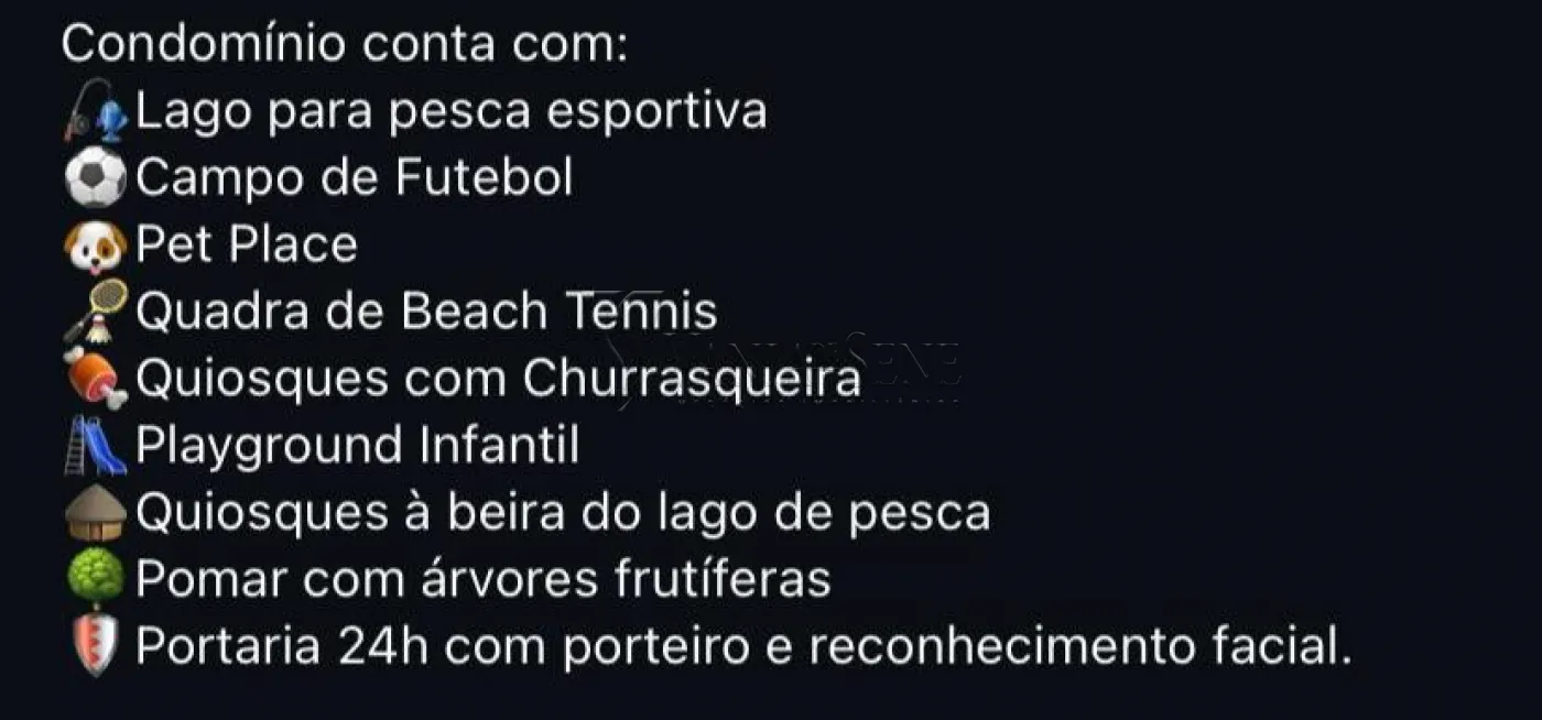 O condomínio oferece excelente infraestrutura com segurança e lazer completo, incluindo parque ao ar livre, quadras esportivas, lago para pesca, trilha de caminhada, espaço pet, redário, quiosque e mercado interno. ?